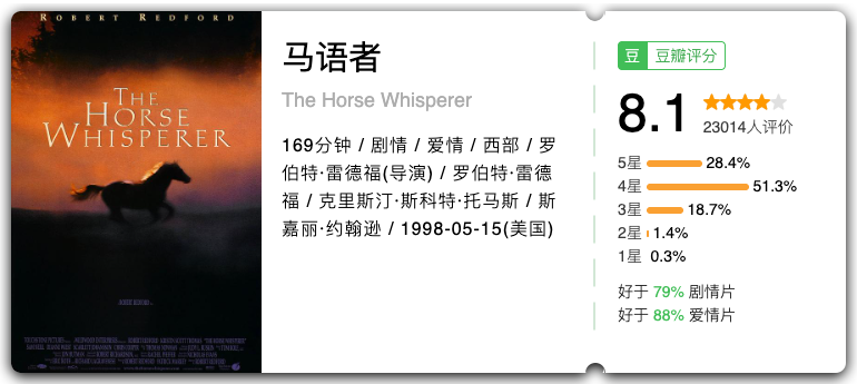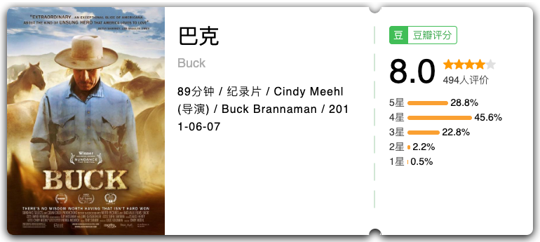 关键词:马术师、疗愈、童年创伤这部获奖纪录片记录了传奇马术师巴克・布兰纳曼的故事。他走出了童年被虐待的阴影,将理解与尊重代替惩罚,用温柔的方式与马匹沟通,治愈了无数有心理创伤的马,也帮助了许多人重新认识人马关系。