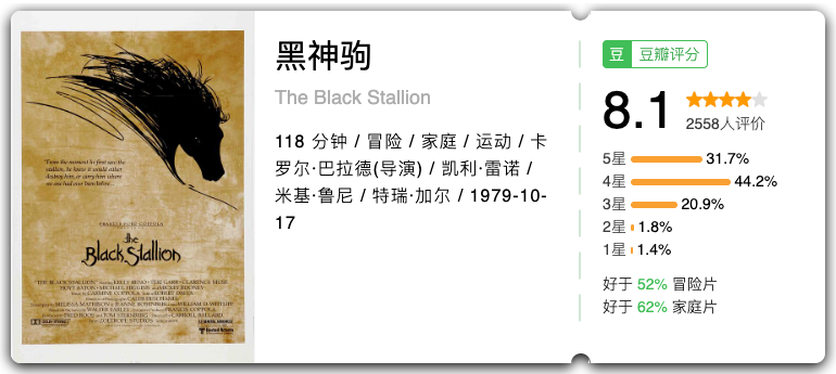 关键词:孤岛奇缘、友谊、成长一个男孩和一匹阿拉伯骏马在海难后被困孤岛,从最初的陌生恐惧,到逐渐建立起跨越物种的深厚友谊。当他们被救回文明社会后,这匹神秘的黑马展现出惊人的奔跑天赋,成为了赛马场上的传奇。影片中男孩与马在海边奔跑的画面,成为了影史上最经典的人马互动场景之一。