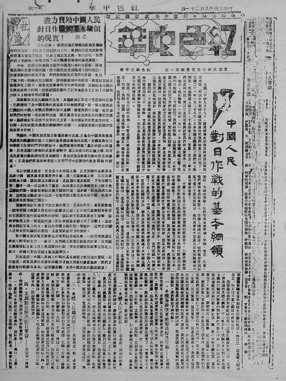 1934年9月21日,《红色中华》刊登的《中国人民对日作战的基本纲领》《中国民族武装自卫委员会为对日作战宣言》