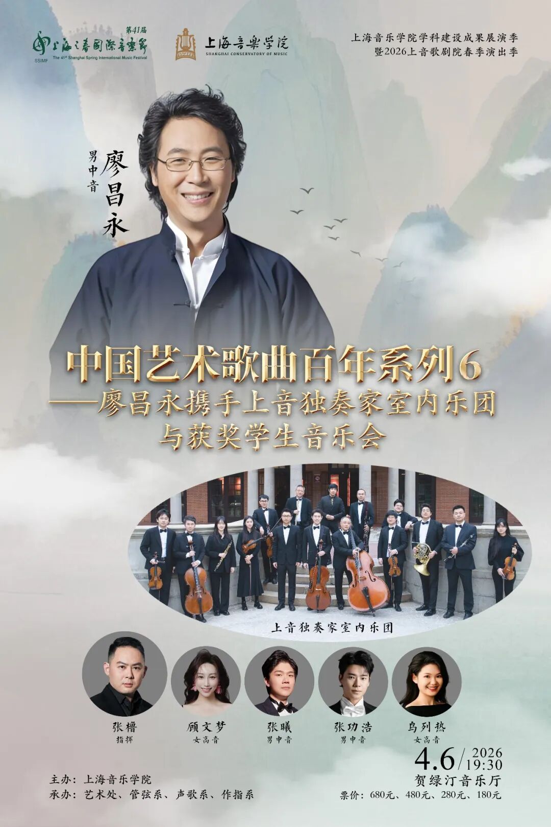 2026年4月6日,作为第41届上海之春国际音乐节“名家名团”板块演出之一,“中国艺术歌曲百年系列”音乐会连续第六年与沪上观众相约,并以系列演出的形式,集中呈现了上海音乐学院近年来在中国艺术歌曲百年历史挖掘整理以及推广育人的阶段成果。在本次音乐会中,上海音乐家协会主席、上海音乐学院院长、著名男中音歌唱家廖昌永与青年指挥家张橹一道,携手四位在声乐比赛获奖的上音学子顾文梦、张曦、张功浩、乌列热与首次亮相该系列的“上音独奏家室内乐团”,以“师生同台”的形式在上海音乐学院贺绿汀音乐厅圆满上演。