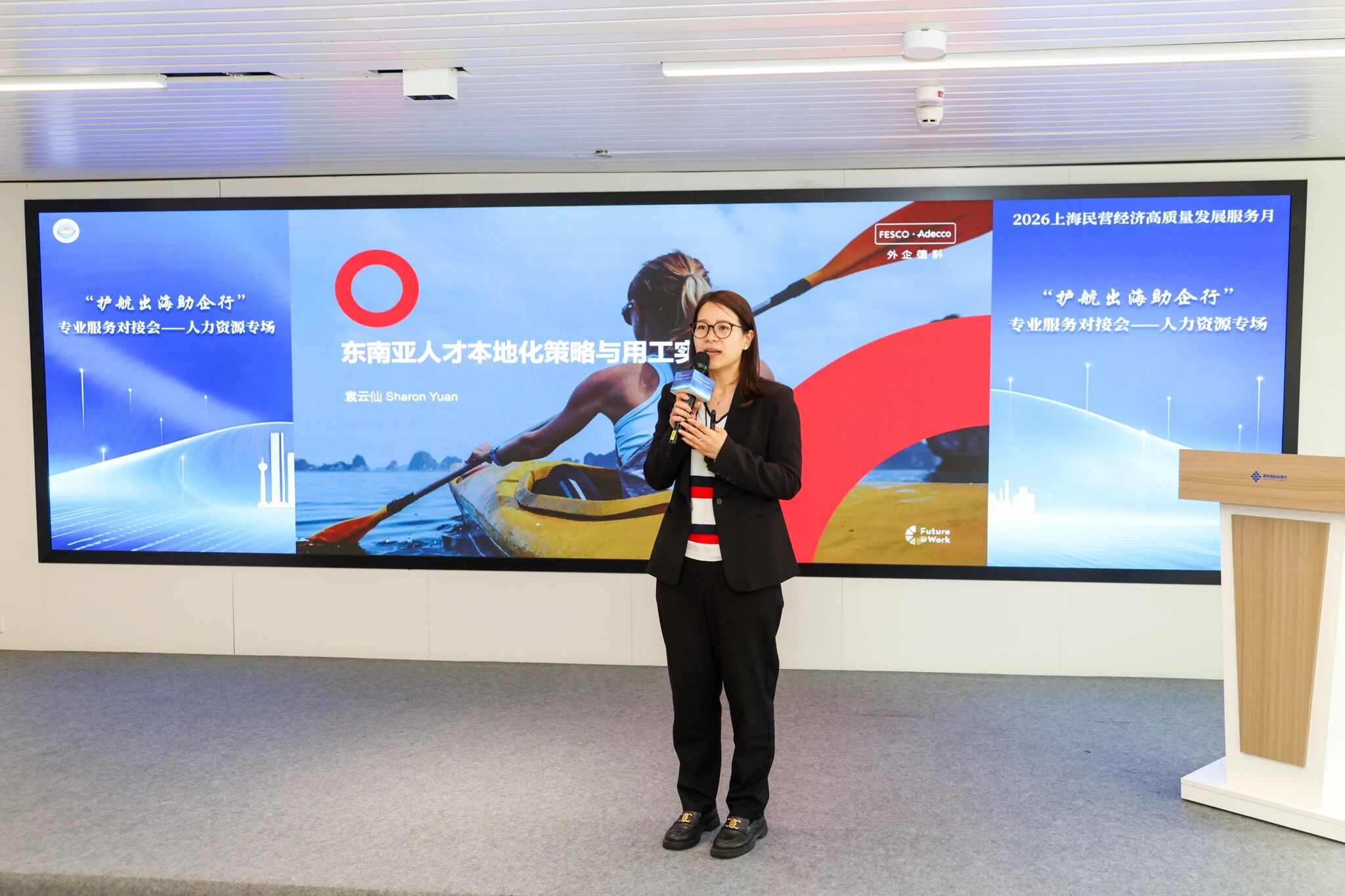 专题宣介环节,行业专家紧扣企业出海高频需求展开深度分享。云生集团海外业务总监汪鸿雁以“全球化视野下的人力资源管理创新与实践”为题,解析跨境用工模式与数字化管理路径;外企德科上海公司国际人力外包事业部高级总监袁云仙围绕“东南亚人才本地化策略与用工实践”,分享重点市场合规用工、团队搭建、成本优化实操经验;静安区人力资源服务产业发展中心主任孙正介绍静安国际会客厅人才服务体系,为企业落地发展提供一站式支持指引。